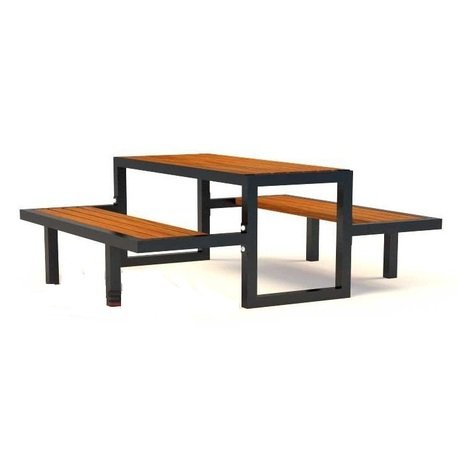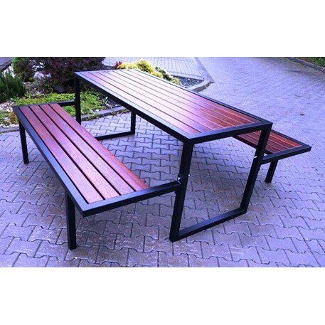 Model of our product range, combining practicality, beauty and stability. A combination of certified wood and high-quality metal. Electrogalvanizing and powder coating protect the metal from corrosion and increase its performance. A special coating is applied to the planks, which protects them from aggressive weather conditions and prolongs their life. The elements connecting the individual structures are made out of stainless steel. Metal and wooden components have different color combinations. Both seats and table top are designed with a bend in the corners for comfort and safety. Practical and stylish model, offering different options in interior and exterior furnishings. Easily and quickly portable due to its lighter weight, it makes it suitable for any home or garden. The metal picnic table is also available with an option for anchoring to the flooring, but only upon request by the client. Elegant solution for furnishing picnic areas in the mountains, chalets, national parks, ski and seaside resorts, beaches. A practical addition to the eco paths, to working production premises, to various urban areas - parks, alleys, schools, playgrounds and other public spaces.